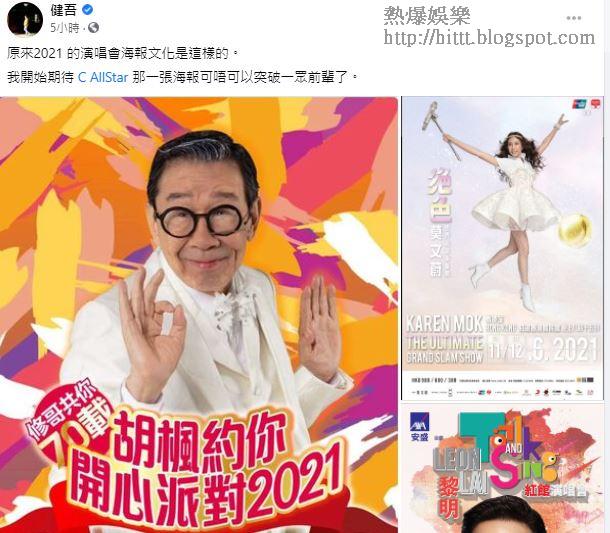 健吾今日亦開post討論呢三張海報「原來2021的演唱會海報文化是這樣的。我開始期待C AllStar那一張海報可唔可以突破一眾前輩」,有網民建議今年7月在紅館開騷的C AllStar,應該有啲突破,整海報時可考慮用「細明體」字試吓!