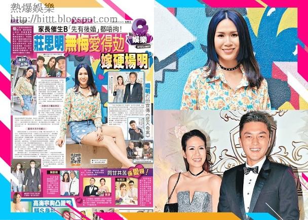 藝人莊思明與楊明拍拖5年,攜手經歷高山低谷,跨越重重難關。目前受官司影響的楊明全面停工,幸運地獲女友義無反顧支持及陪伴。思明不諱言已視男友為終身伴侶,從未有絲毫悔意,亦沒有打算放棄這段感情,更大爆被雙方母親催生B,不排除年內隨時步入教堂。