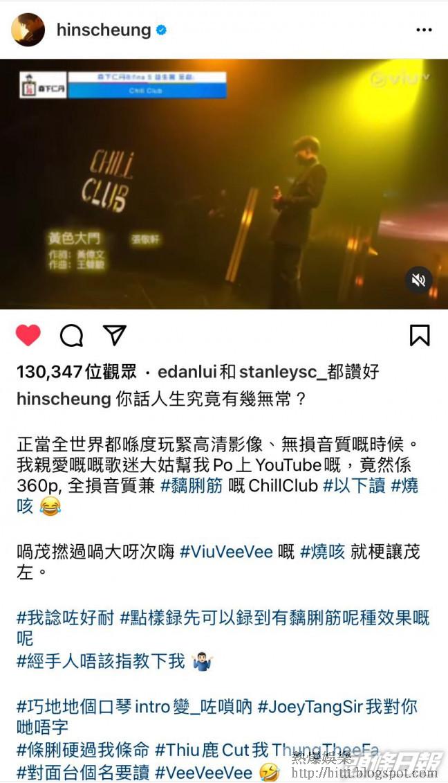 張敬軒(軒仔)最近走勻兩台的音樂節目,作客ViuTV音樂節目《Chill Club》的一集昨晚播出,靚聲當然令一班觀眾聽出耳油,仲有粉絲將他獻唱《黃色大門》一曲的片段,特意上載到YouTube同大家開心Share。不過,此舉似乎引起軒仔「不滿」,事關影片被壓縮至「Fi Fi」聲,其靚聲亦變成「黐脷筋」!軒仔昨晚在IG轉發該片,並以「你話人生究竟有幾無常?」為題,搞笑留言:「正當全世界都喺度玩緊高清影像、無損音質嘅時候。我親愛嘅歌迷大姑幫我po上youtube,竟然係360p、全損音質兼黐脷筋嘅Chill Club,以下讀『燒咳』。」