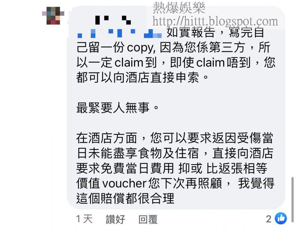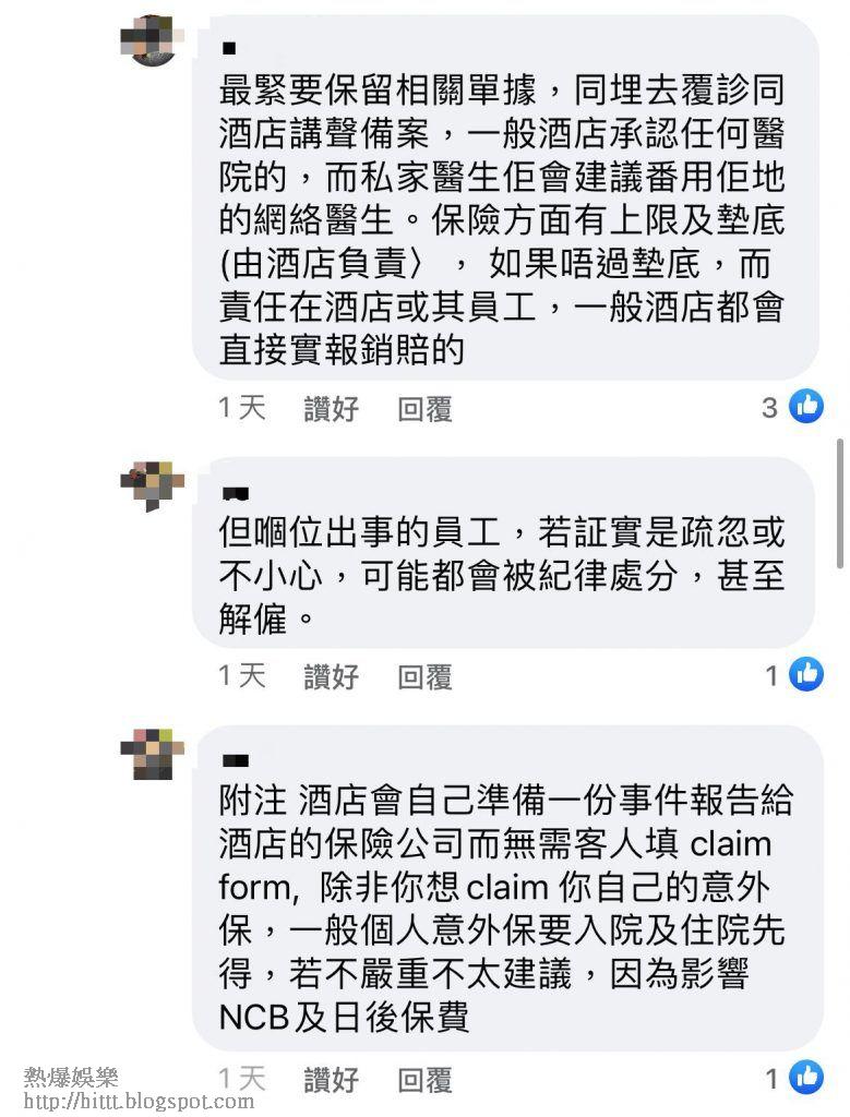 酒店方其後聯絡事主,表示會找保險公司報銷醫療費用及來回醫院車資。事主其後以「有冇朋友試過住酒店住到要去醫院,要claim酒店有咩要注意?」為題,將經歷分享至facebook群組,並在帖文內表示:「但係我要填番一份claim form去claim……」似乎略有不滿。