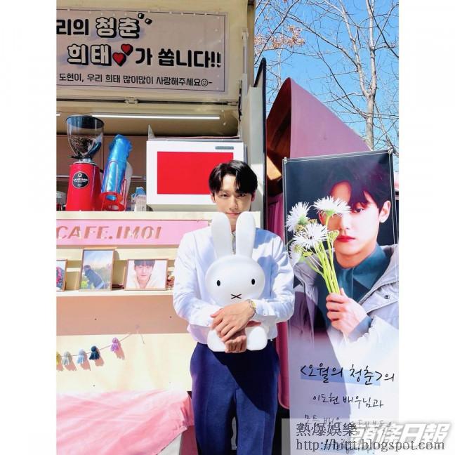 韓國男星李到晛正為新劇《五月的青春》拍攝,他在IG上傳咖啡餐車認證照,原來是一班日本粉絲越洋為他加油。餐車上有好多李到晛嘅相同Poster,佢仲攬實一隻兔仔卡通公仔影相,童心未泯,唔知係咪同樣由Fans送呢?