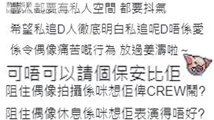 有網民亦爆料指姜濤連跑步都有fans跟,甚至有人在跟偶像時不小心遺留手袋,要姜濤在fans開的TG問人是否不見手袋。有網民說:「藝人都要有私人空間,都要唞氣,希望私追啲人徹底明白私追唔係愛,係令偶像痛苦嘅行為,放過姜濤」、有人亦說:「搞到屋企人應該係佢底線啦,佢咁錫屋企人,尤其爸爸早排中過風。」