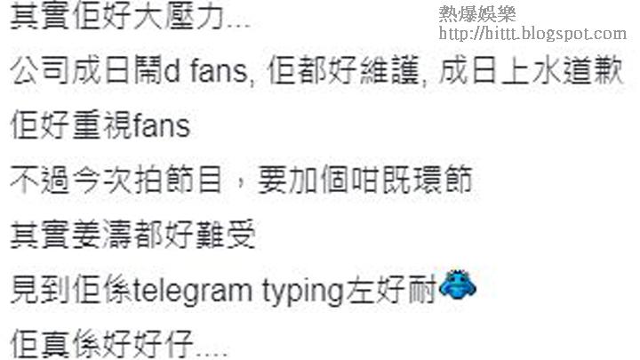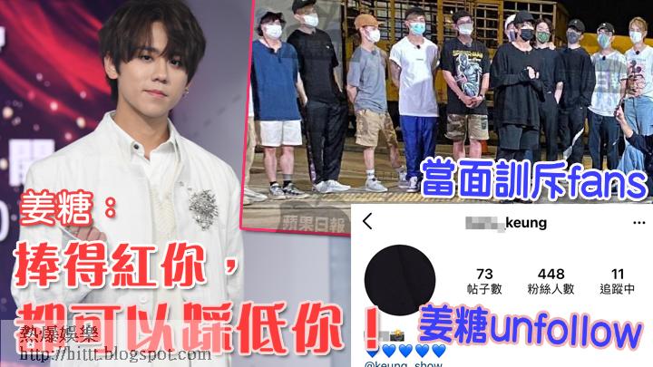 據知,姜濤和MIRROR成員由前日(1日)開始,一連數天在梅窩拍攝外景,但昨晚有超過200個fans聚集在拍攝場地。眼見情況失控,MIRROR隊長Lokman(楊樂文)便帶頭和其他11位成員一字排開,向fans作出呼籲,勸他們離開現場,但可惜不得要領,而姜濤說話時,曾當面斥責fans,語氣和用詞前所未有地嚴厲,令部份fans感到傷心失望,更有人即時unfollow偶像。因此,姜濤晚上在TG留言向fans補鑊。