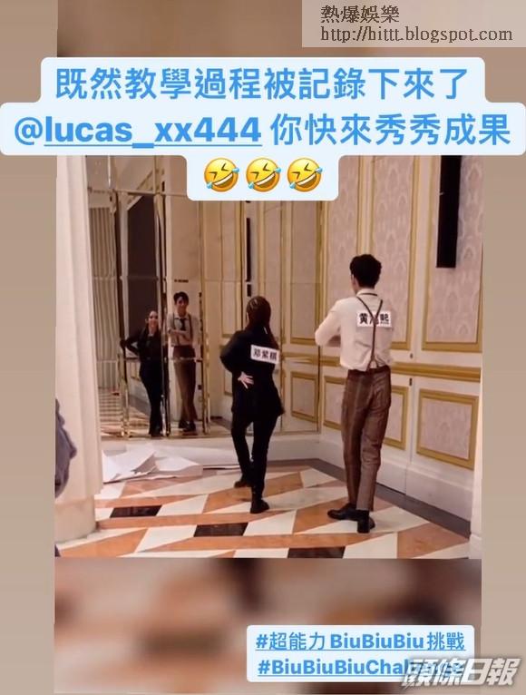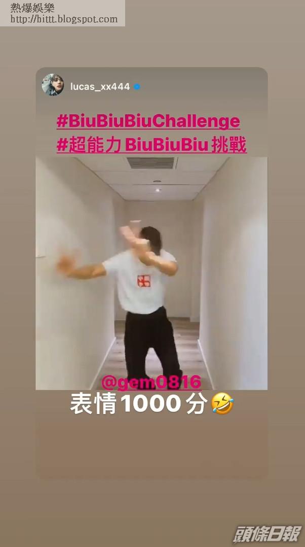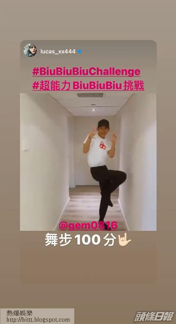 昨晚Lucas在IG上載《超能力》挑戰的短片,片段開頭,身穿白色tee,戴着黑色cap帽的Lucas像特工般登場,之後在走廊大跳勁舞,可見熟練舞步的Lucas充滿自信,一邊笑一邊跳,最後雙手高舉V字手勢走出鏡頭作結。之後老師G.E.M.亦轉發片段,大讚Lucas:「舞步100分」,「表情1000分」