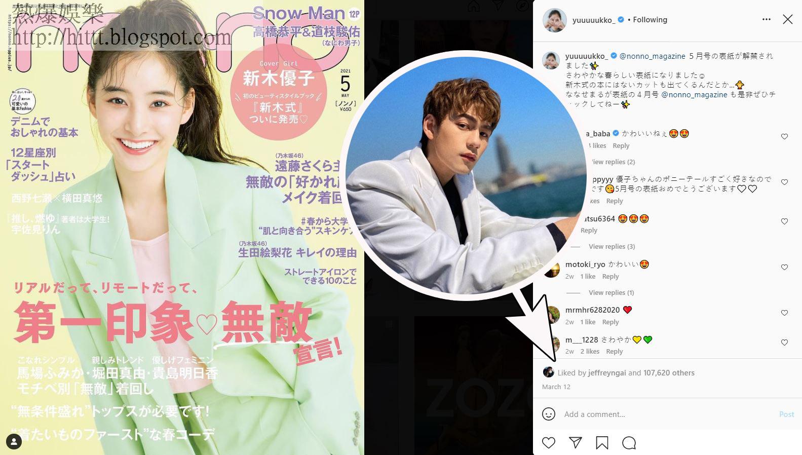 新木優子的IG有多達418萬網民追隨,她近日分享自己的反串造型照,立即獲大批日本圈中人讚好支持,當中包括山田孝之、鈴木保奈美、土屋太鳳、朝比奈彩及內田理央等,而這位長腿女神,在本地也有不少星級粉絲,當中包括香港新一代男神魏浚笙(Jeffrey)也有follow,他亦讚好新木優子今次的中性打扮,似乎不擔心女友呷醋。