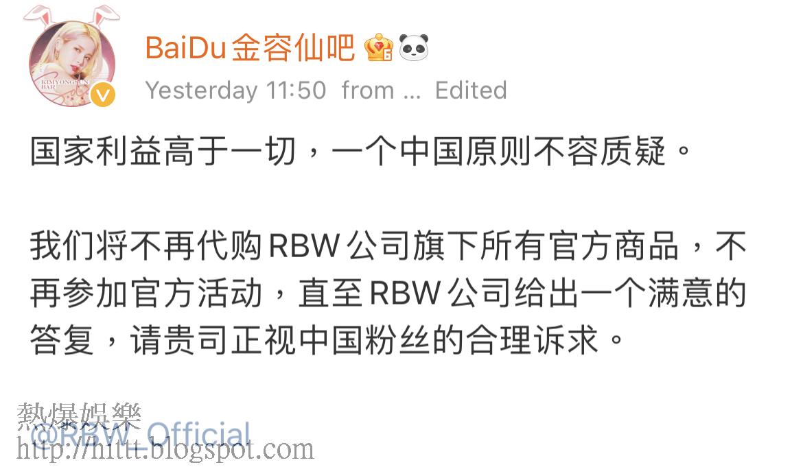 RBW彈出又彈入惹來了兩地的網民討論,當中強國網民更嬲爆RBW突然反口不承認「一個中國原則」,除了在網上圍剿RBW外,連帶MAMAMOO各成員都大受影響。當中MAMAMOO成員在大陸微博的fans專頁都先後發聲表示:「國家利益高於一切,一個中國原則不容置疑。我們將不再代購RBW旗下所有官方商品,不再參與官方活動,直至RBW公司給一個滿意的答覆,請貴司正視中國粉絲的合理訴求。」