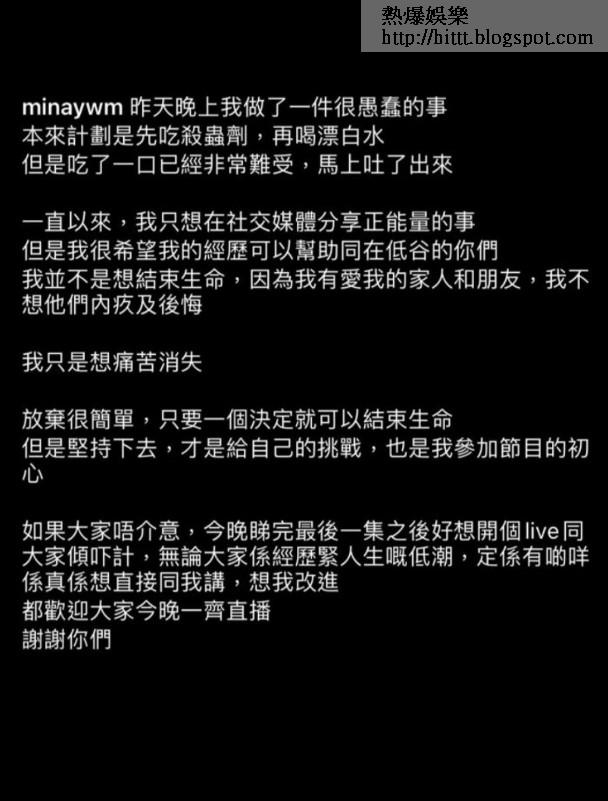 楊慧敏喺社交網上載相片,見到有殺蟲藥同紙巾等,佢發文話自己做咗件蠢事,本來計劃先食殺蟲藥,再飲漂白水,不過食咗一啖好難受,即刻吐番出嚟,佢留言話其實唔係想結束生命,更加唔想令到家人同埋身邊支持佢嘅人內疚同後悔,繼續堅持落去,先至係佢參賽嘅目的。而喺發文尾段,佢話想今晚開Live,邀請網民分享人生低潮,同埋提醒佢有乜可以改進嘅地方。相信佢今晚可以開Live,身體都應該冇乜大問題。