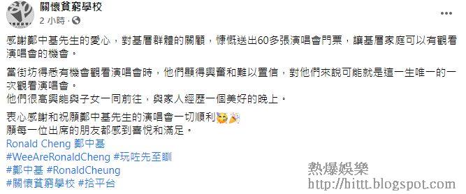 社福機構「新福事工協會」晚上在facebook多謝鄭中基,送出60多張門票予基層家庭睇演唱會:「當街坊得悉有機會觀看演唱會時,他們顯得興奮和難以置信,對他們來說可能就是這一生唯一的一次觀看演唱會。他們很高興能與子女一同前往,與家人經歷一個美好的晚上。」