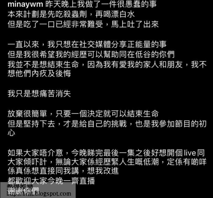 楊慧敏在IG story表示,自己做了一件很愚蠢的事,本來計劃先吃殺蟲劑,再喝漂白水,但是吃了一口已經非常難受,馬上吐了出來。她向網民及親朋致歉,並指不會再做傻事。她留言:「一直以來,我只想在社交媒體分享正能量的事,但是很希望我的經歷可以幫助同在低谷的你們,我並不是想結束生命,因為我有愛我的家人和朋友,我不想令他們內疚及後悔。我只是想痛苦消失,放棄很簡單,只要一個決定就可以結束生命,但是堅持下去,才是給自己的挑戰,也是我參賽的目的。」