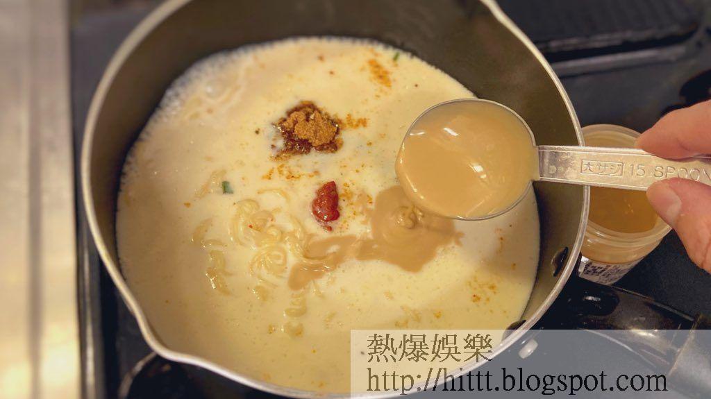 首先都係同平時一樣,將即食麵煮3分鐘,想有啲嚼勁嘅朋友就按個人喜好調節煮嘅時間!然後加入原來跟埋嘅調味粉包之外,再加入300ml豆乳、兩匙芝麻醬、一匙豆瓣醬,同埋半匙糖,充分煮熱後湯會變得更香口濃郁,淨係聞到都流晒口水!