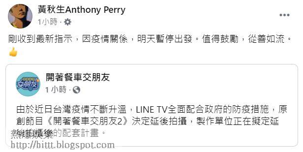 本月上旬台灣爆出肺炎病例,在限聚令下,很多劇組都要停工。由黃秋生主持的《開著餐車2》已完成3集,經過同劇組開會後,秋生今日在FB透露同劇組反映無效後,原本篤定明天到台東復工。事後網民大表反感,指劇組漠視社會責任,聲言會到製作公司抗及罷睇後。下午4時許秋生在FB貼出劇組最終決定「由於近日台灣疫情不斷升溫,LINE TV全面配合政府的防疫措施,原創節目《開著餐車交朋友2》決定延後拍攝,製作單位正在擬定延後拍攝後的配套計畫。」而秋生要在6月初返港,演出舞台劇《ART呃》,而《餐車2》尚餘9集未完成。