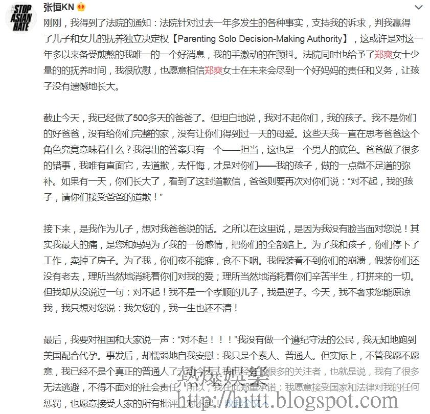 大陸女星鄭爽在今年初被爆與舊愛張恒於美國秘婚兼找代母誕下一子一女,其後再爆出鄭家主張棄養,鄭爽隨即被瘋狂鬧爆,更因此被大陸官媒狠批及封殺,鄭爽形象及事業一鋪清袋,甚至有傳她要向廣告商賠上過億的賠償金。今年3月,鄭爽與張恒打官司爭撫養權,事件經過法院個多月處理,張恒昨日在微博貼文表示自己贏得子女的撫養獨立決定權(Parenting Solo Decision-Making Authority),收到消息一刻雙手激動顫抖!鄭爽至今仍未為事件作出回應。