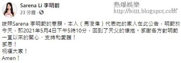 抗癌鬥士李明蔚(Sarena)於2012年患上罕見病「鼻咽腺樣囊性癌症」,多年來一直積極抗病。最近她病情反覆,日前已轉入療養院。今日傳出噩耗,Sarena不敵病魔,終年31歲。好友馬浚偉代李明蔚在社交網發文,留言:「按照Sarena 李明蔚的意願,本人(馬浚偉)代表她的家人在此公告,明蔚於今天,即2021年5月4日下午5時10分,回到了天父的懷抱。感謝各方對明蔚一直以來的關心、支持和愛護!感恩!祝福大家!Amen!」