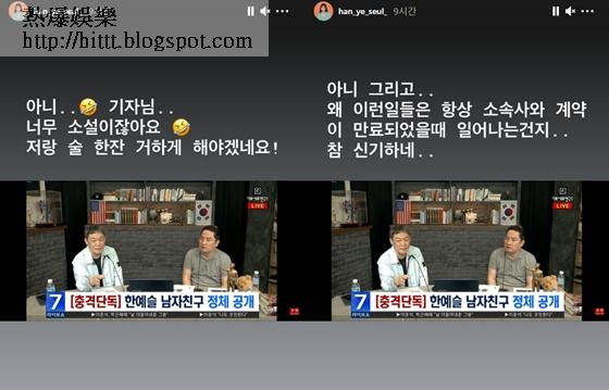 對於男友遭到爆料,韓藝瑟亦即時反擊,並上載截圖留言:「太像小說了吧,要和我喝一杯了。」又語帶相關表示:「還有...為甚麼這些事情會在和所屬公司合約到期的時候發生呢?太神奇了。」似乎暗示因為合約問題遭到攻擊。