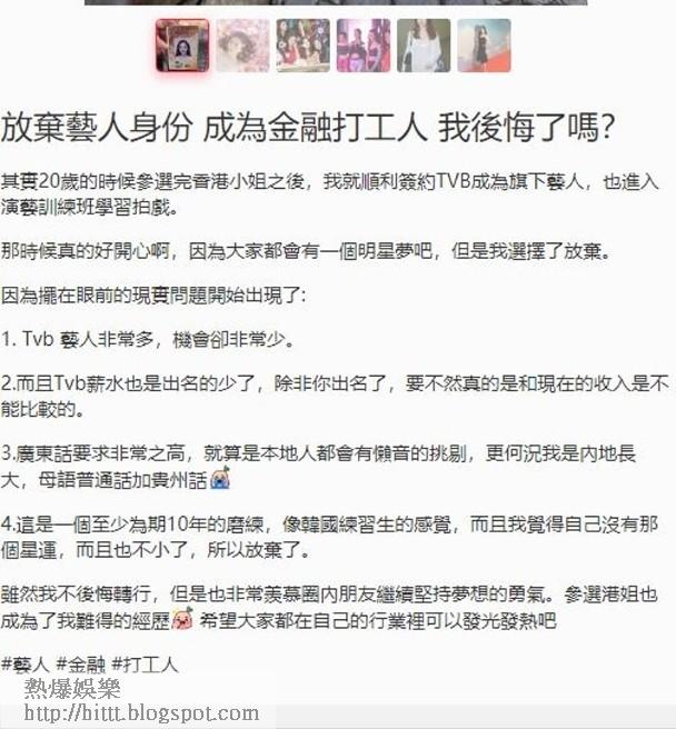2017年港姐Krystal(楊帆)參選時擁一股仙氣,令人眼前一亮,惟可惜最終大熱倒灶,落選後加入TVB當藝人。日前,她在社交平台表示已放棄藝人工作,並已轉投金融OL職場,她表示:「其實20歲的時候參選完香港小姐之後,我就順利簽約TVB成為旗下藝人,也進入演藝訓練班學習拍戲。那時候真的好開心啊,因為大家都會有一個明星夢吧,但是我選擇了放棄。」
