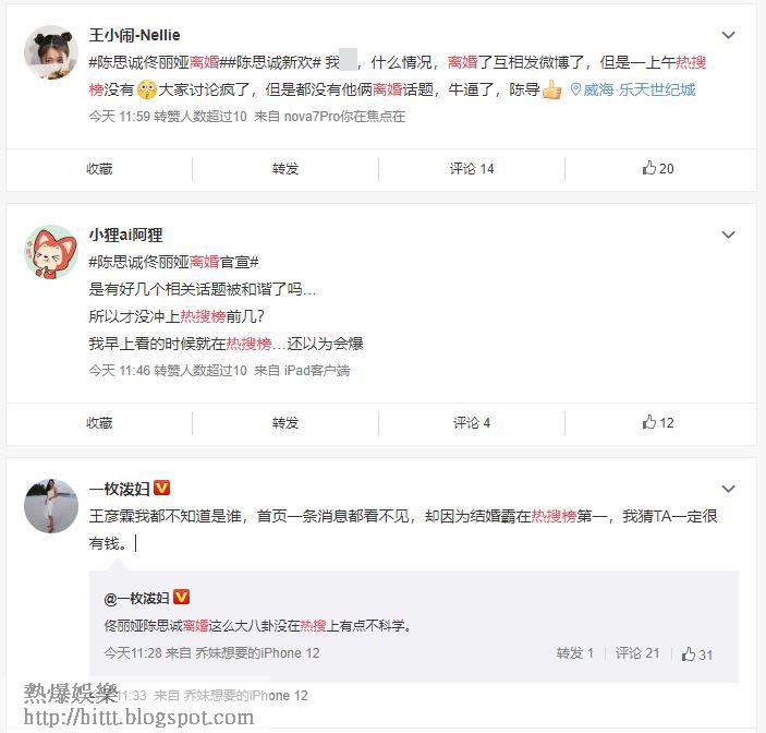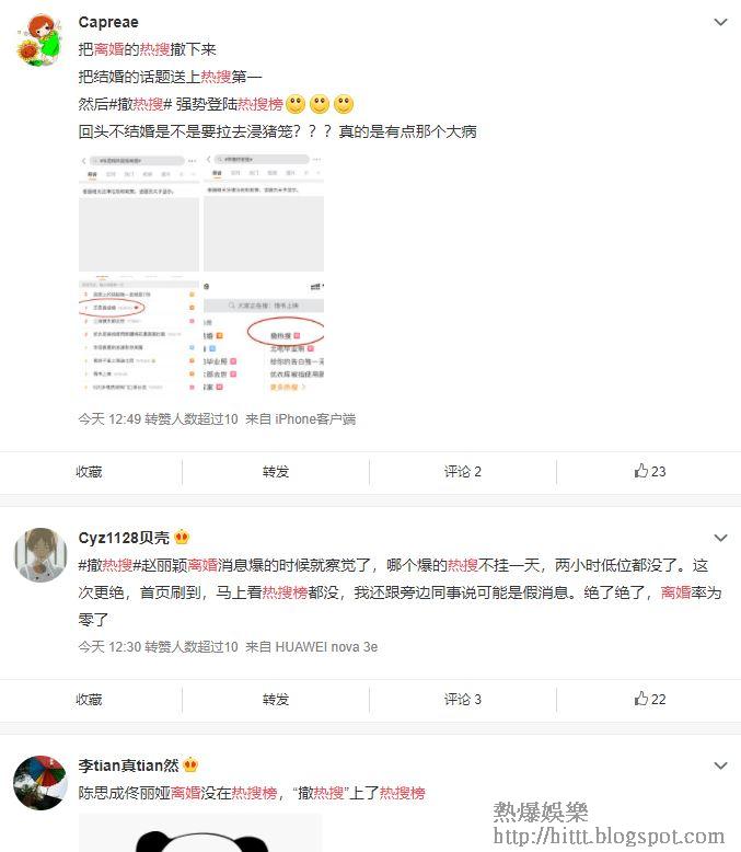 一眾大陸網民對這種「和諧」的做法似乎並不欣賞,留言指「520」不容許看到離婚在熱搜榜上是「神操作」、「佟麗婭陳思誠離婚這麼大八卦沒在熱搜上有點不科學」等,雖然佟麗婭陳思誠離婚新聞在熱搜榜中被撤走,但當網民在討論微博撤走離婚新聞時,「撤熱搜」這3個字卻成為微博熱搜,認真諷刺。