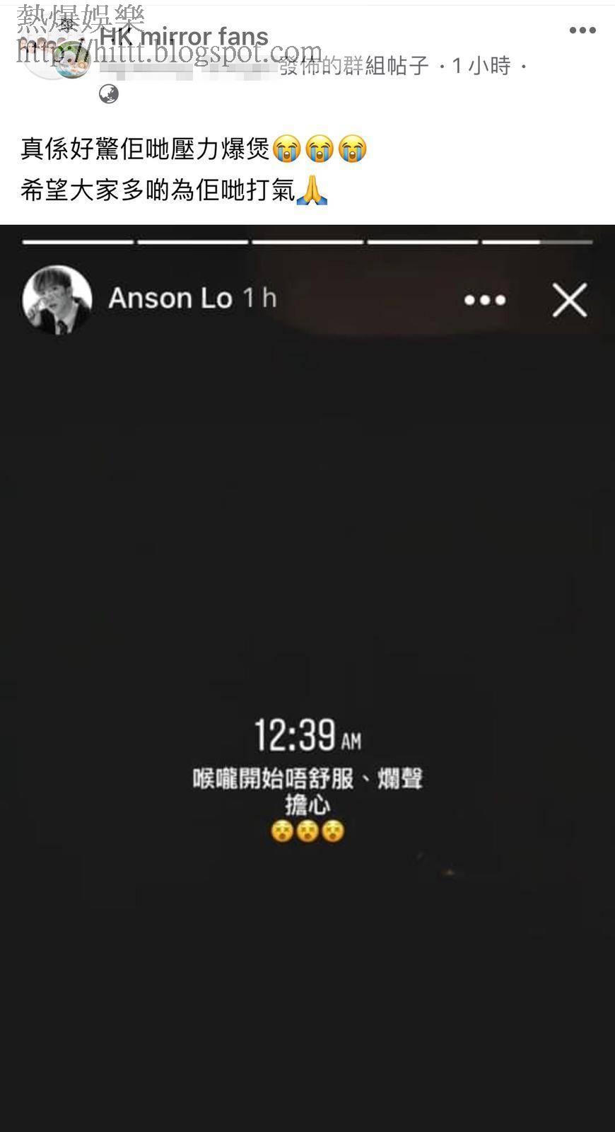 隨後Anson Lo再寫上跟醫生的對話,醫生叮囑他兩星期內不要講話,但Anson Lo向醫生表示後日便要開騷,醫生說:「我意思係除咗工作之外,唔好同人講嘢。」結果Anson Lo遵從醫生叮囑而減少說話,他直呼「好唔習慣」。正當他昨日準備外出作演唱會前一項工作時,他自拍手握拳頭相片寫上「奸巴爺」為自己打氣,當他發現寫錯字後再貼文更正「係『奸巴爹』,而家進化到打字都有困難」,其實能夠理解Anson Lo身心相當疲累,只要看到醫生開給他多包藥便得知,Anson Lo再在IG寫上「show前一定要唱到」。
