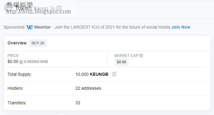昨日發現有人以姜濤(Keung To)及MIRROR的名字註冊虛擬貨幣,根據加密貨幣網站BscScan顯示,「MirrorHK」幣的總數有100億個,而「KEUNGB」幣則有1萬個,分別有22人持有,而根據顯示,兩款虛擬貨幣均已經能夠交易,姜濤幣更有價至500元港幣一粒,認真誇張!而在Facebook有位名叫Candy Keung自稱「KEUNGB」幣是由她創造,她表示創造這些幣的原因是太愛姜B,本意是造一萬個來儲,還說想送一些「KEUNGB」幣給偶像姜濤。
