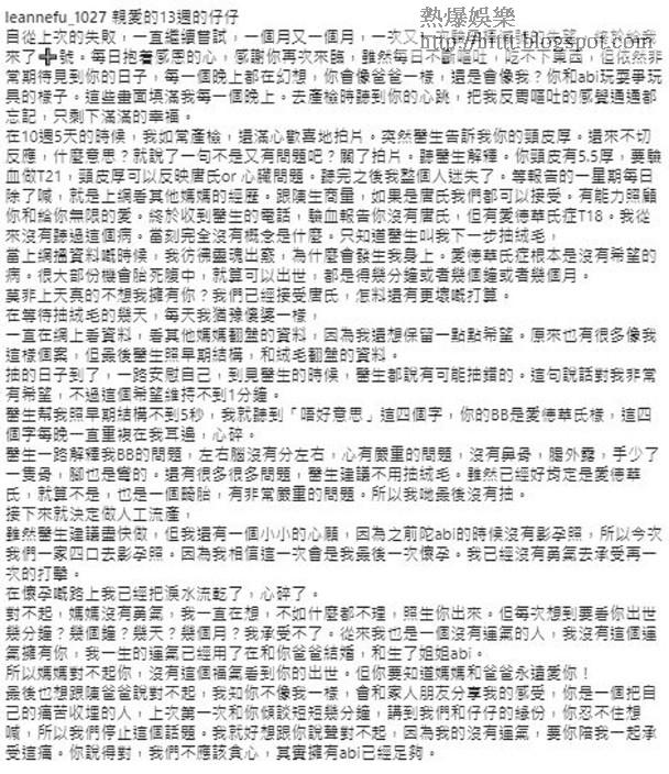 Leanne發長文剖白恍如坐過山車的心路歷程,透露在懷孕10周5天時去產檢,醫生告訴她BB頸皮厚,要驗血做T21,即是可反映唐氏綜合症(唐氏)或心臟問題,她說:「聽完之後我整個人迷失了。等報告的一星期每日除了喊,就是上網看其他媽媽的經歷…」最終與老公商量後,決定如果BB是唐氏都可以接受:「有能力照顧你和給你無限的愛。」雖然最終證實沒有唐氏,但卻有「愛德華氏症T18」:「醫生一路解釋我BB的問題,左右腦沒有分左右,心有嚴重的問題,沒有鼻骨,腸外露,手少了一隻骨,腳也是彎的。還有很多很多問題…」結果要做人工流產,不過在做手術前,她決定「一家四口」影孕照,因為佗Abigail時沒有影相記錄,相中3人都笑容滿面,不過更甚的是她決定不再懷孕:「因為我相信這一次會是我最後一次懷孕。我已經沒有勇氣去承受再一次的打擊。」而最後,她向Jason說對不起:「因為我的沒有運氣,要你陪我一起承受這痛。你說得對,我們不應該貪心,其實擁有abi已經足夠。」