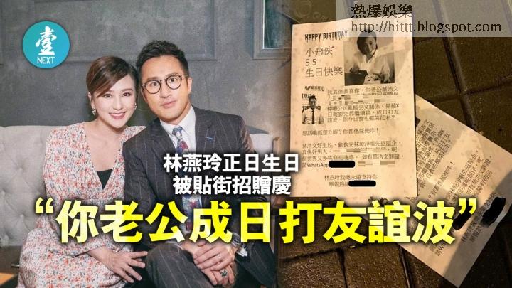前TVB主播,人稱小飛俠的林燕玲,今日(5月5日)42歲生日。不過,卻被貼街招贈慶,大致內容是指她老公亂搞男女關係: