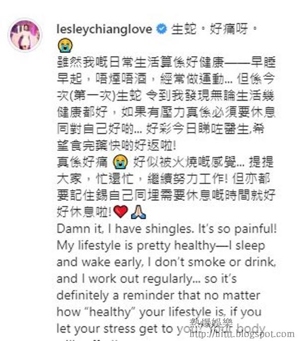 藝人姜麗文最近劇接劇忙過不停,剛完成拍攝《白色強人II》,又即將要為《雙生陌生人》開工,不過近日佢就自爆捱唔住,不幸病倒「生蛇」!佢喺社交網發文透露病況:「生蛇,好痛呀。雖然我嘅日常生活算係好健康,早睡早起,唔煙唔酒,經常做運動...但係今次(第一次)生蛇,令到我發現無論生活幾健康都好,如果有壓力真係必需要休息同對自己好啲,好彩今日睇咗醫生,希望食完藥快啲好番真係好痛,好似被火燒嘅感覺...提提大家,忙還忙,繼續努力工作!但亦都要記住錫自己,同埋需要休息嘅時間就好好休息」