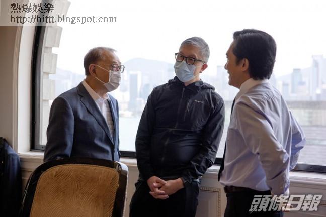楊受成博士(左)親臨半島酒店拍攝現場,直擊兩大影帝的精彩鬥戲。