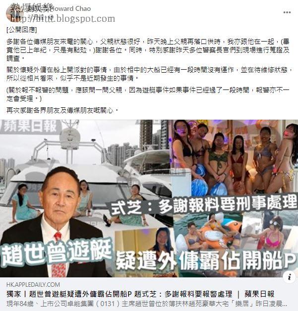 富商趙世曾近日可謂家事「煩」忙,繼趙宅昨日凌晨被賊人潛入爆竊後,今日有《蘋果》讀者爆料指,一班疑似外傭在趙生的遊艇上開派對。對於事件,趙世曾的女兒趙式芝和兒子趙式浩先後回應,並指會替父親了解事件。直至今午,兒子趙式浩在其社交網對事件作公開回應。