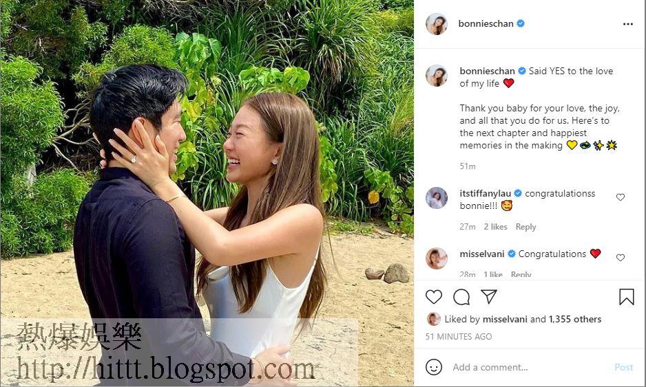2016年香港小姐季軍陳雅思(Bonnie)在去年6月宣佈離開無綫,專注發展瑜伽事業,今日傳出喜訊,Bonnie在社交平台貼上與男友對望的合照,正式宣佈將成為人妻,她以英文留言:「Said YES to the love of my life.」並感謝另一半為她所做的一切,兩人將踏入人生新一章及共同製造美好的回憶。一眾好友包括丁子田、倪晨曦、劉穎鏇等紛紛留言祝福。