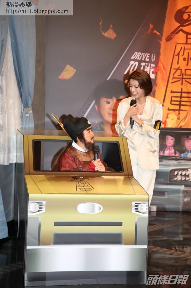 方力申和當奴以鍾馗扮相亮相他們主持明日上架的myTV SUPER節目《鬼上你架車》記者會,與嘉賓蔡思貝分享靈異經歷。