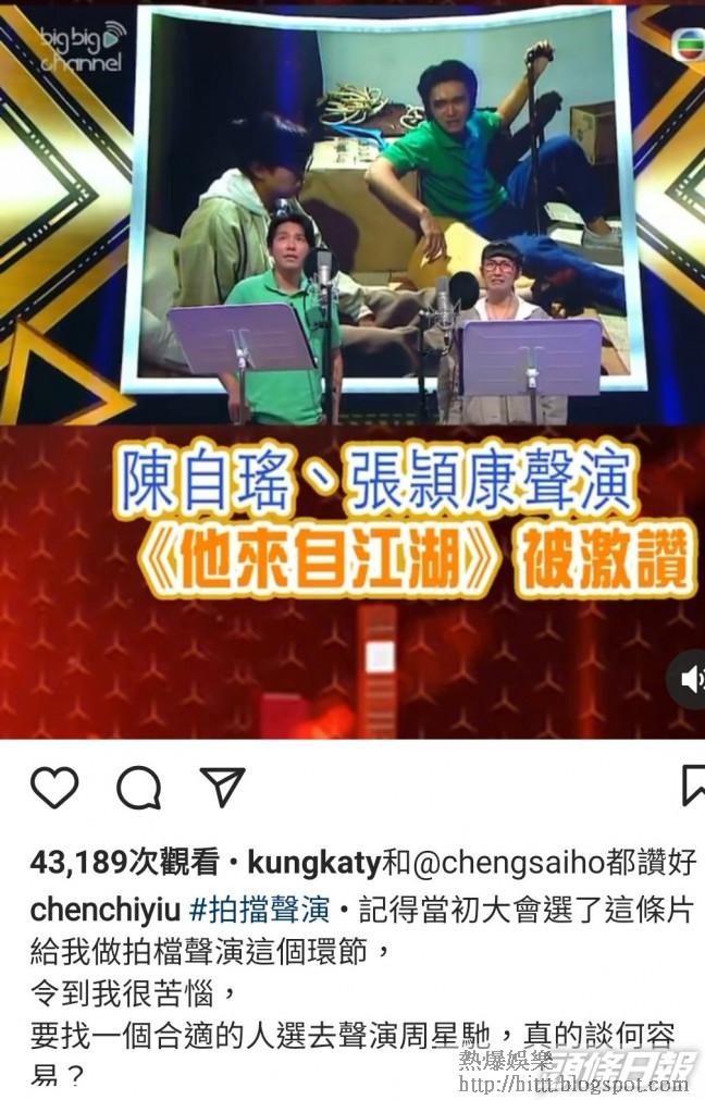 陳自瑤留言:「之前真係『三顧草廬』揾左康哥出山,做我聲演的拍擋!要聲演星爺,我除左搵你都唔知可以搵邊個!多謝你嘅仗義幫忙!小女子銘記於心!」她贏得評判激讚後再留言:「記得當初大會選了這條片給我做拍檔聲演這個環節,令到我很苦惱,要找一個合適的人選去聲演周星馳,真的談何容易?加上每個演員都很忙,還要擠出時間和我一起練習,真是難上加難!?正當我非常苦惱之際,我想起了張穎康,因為在之前拍攝的一套劇集,他是我的好拍檔,也是一位非常用心的演員,加上我覺得他的外型,平時說話的語氣跟星爺有幾分相似!當我找他的時候,他說他聽到我的聲音很無助很可憐?所以他就二話不說一口答應!(麥雅緻也有幫口)好拍檔,我想講,真係好多謝你!多謝你肯花時間同我一齊練習,練完你同你老婆仲要煮埋飯俾我食!沒有你,沒有這個演出,你的聲線語氣真的很像星爺,你真係演繹得好好!多謝你同我一齊經歷這個美好的旅程!兄弟,感激你們一家!」