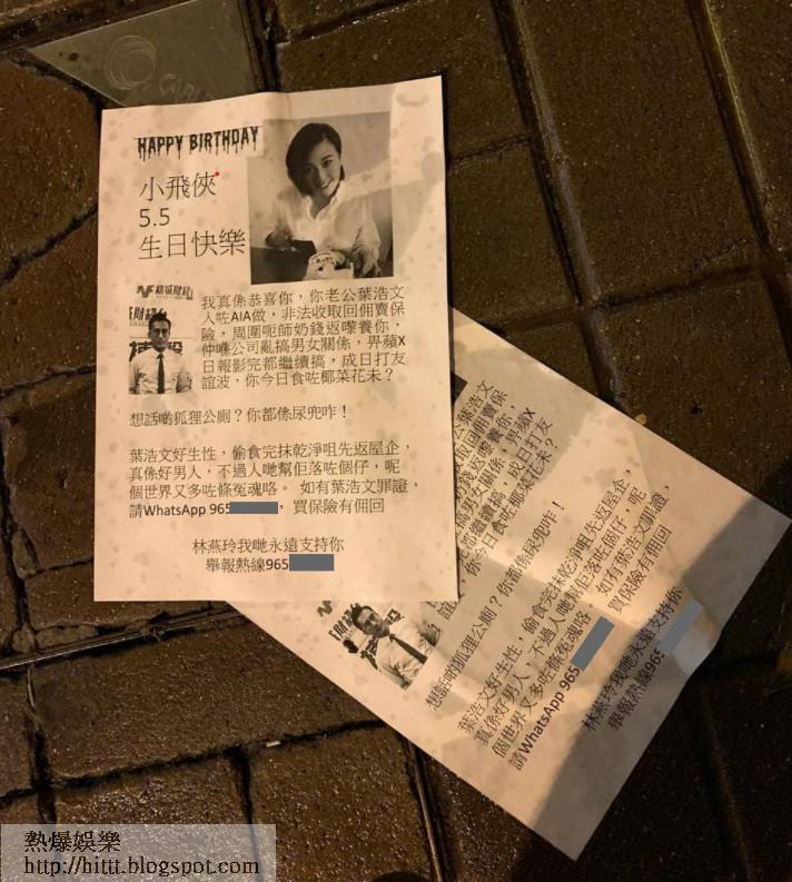 街招上大大隻字寫上「小飛俠5.5生日快樂」,內容針對小飛俠老公葉浩文:「周圍呃師奶錢返嚟養你,仲喺公司亂搞男女關係。」、「葉浩文好生性,偷食完抹乾淨咀先返屋企,真係好男人,不過人哋幫佢落咗個仔,呢個世界又多咗條冤魂路。」街招上並附有一個電話號碼,稱「如有葉浩文罪證,請WhatsApp 965XXXXX」,不過,這個其實是葉浩文的電話,認真大整蠱。