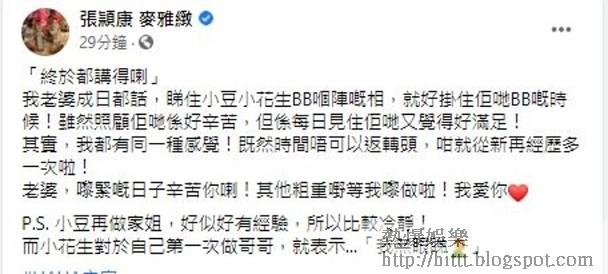 未有透露BB性別的張頴康,以「終於都講得嘞!」來表達箇中興奮,他留言:「我老婆成日都話,睇住小豆小花生BB嗰陣嘅相,就好掛住佢哋BB嘅時候!雖然照顧佢哋係好辛苦,但係每日見住佢哋又覺得好滿足!其實我都有同一種感覺!既然時間唔可以返轉頭,咁就重新再經歷多一次」