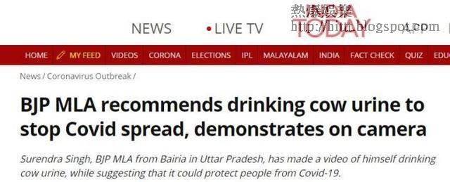 印度媒報道,人民黨(BJP)議員辛格拍片分享如何飲用牛尿令佢免受新冠病毒嘅侵害。辛格喺影片中稱,牛尿保護佢即使每日喺公共場所18個鐘頭,仍然身體健康免受新冠肺炎嘅侵擾。
