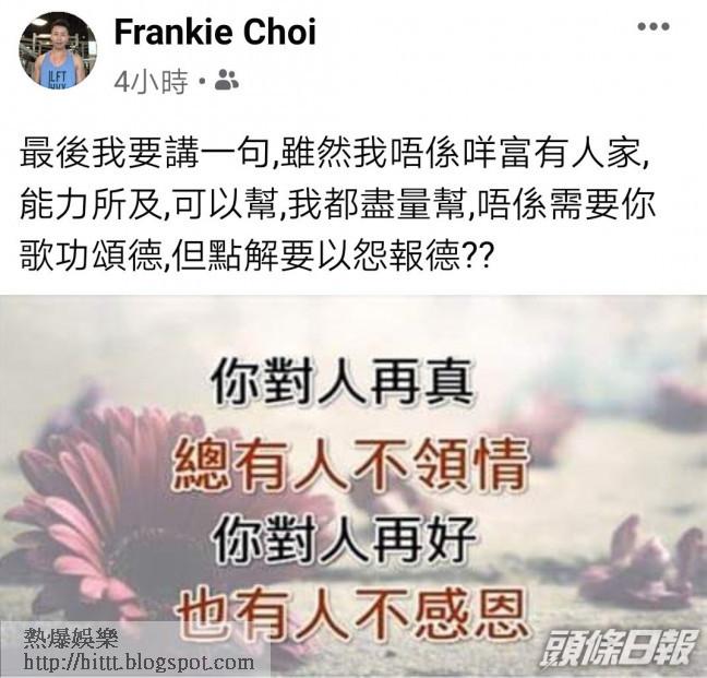 提到傳她破產後即被蔡國威「迫遷」,兩人友情一刀兩斷,她鐵證有此事:「其實呢兩年嚟,佢一路以我名聲,不停約啲記者去做訪問,喺TVB度搲撈,所以佢會出千字文、萬字文,我一啲都唔出奇,呢啲可以睇到佢係乜嘢嘅人。我破產之後,佢當晚問我幾時搬走?而嗰個星期我搵樓期間好唔開心,好難受!每日要睇嘅面色,真係好難受,所以我冇心情,只係客客氣氣去包容佢...真係睇清楚呢個人囉!」她重申「我係喺佢屋企住咗兩年,但我冇白食白住,所有嘢做足㗎!呢兩年嚟記者偷拍、做新聞,全部由佢操控...呢兩年佢都幾好呀!有幾多新聞呀!其實由佢當初話我食佢、住佢、靠佢,佢又突然間改口風,話我有畀錢!」