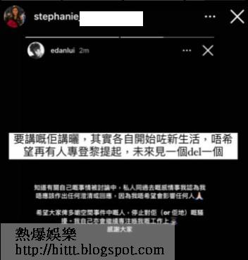 《蘋果》聯絡Edan求證,但沒有回覆,直至下午,Edan在限時動態留言撲火,惟沒否認網民的指控:「知道有關自己嘅事情被討論中,私人同過去嘅感情事我唔應該作出任何澄清或回應,因為我唔希望會影響任何人。希望大家畀多啲空間事件中嘅人,停止對佢(or佢哋)嘅騷擾。」Edan表示會繼續專注工作,而鏡粉亦留言鼓勵:「流言蜚語係點都陪你」、「無論點都會支持你」、「相信你」,不過,亦有網民留言罵他「狗公」。至於Stephanie則在Edan發文2分鐘後,火速出post回應:「要講嘅佢講曬,其實各自開始咗新生活,唔希望再有人專登嚟提起,未來見一個del一個。」