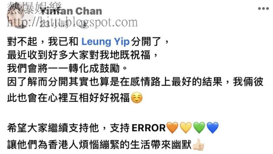 MIRROR和ERROR近日紅到發紫,可是兩隊隊員事業得意,情場上卻遇上挫折,其中Edan(呂爵安)就被爆曾背舊愛Stephanie出軌,更流出疑似情慾短訊。至於同初戀女友「阿芬」拍拖8年的ERROR成員(梁業),一直表現恩愛,二人被外界視為打風打唔甩的一對,可惜昨日卻爆出「分訊」,阿芬在facebook宣佈和肥仔分手消息,她留言說:「對不起,我已和Leung Yip分開了,最近收到好多大家對我哋嘅祝福,我們將會一一轉化成鼓勵。」阿芬指和梁業是因了解而分開,亦算是在感情路上最好的結果。雖然和肥仔分手,但阿芬坦言彼此會互相祝福對方,似是好聚好散的一對。她又希望大家繼續支持肥仔同ERROR,她說:「讓他們為香港人煩惱繃緊的生活帶來幽默。」阿芬的好友紛紛留言安慰她。