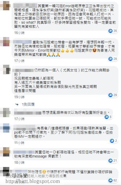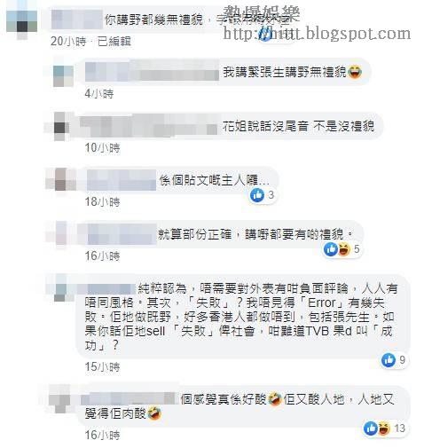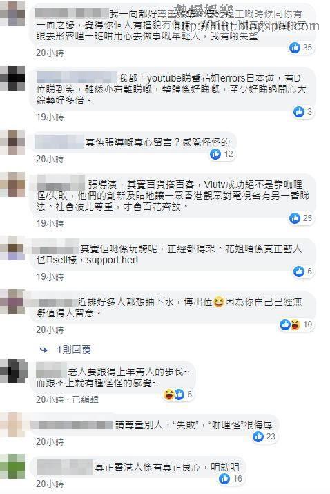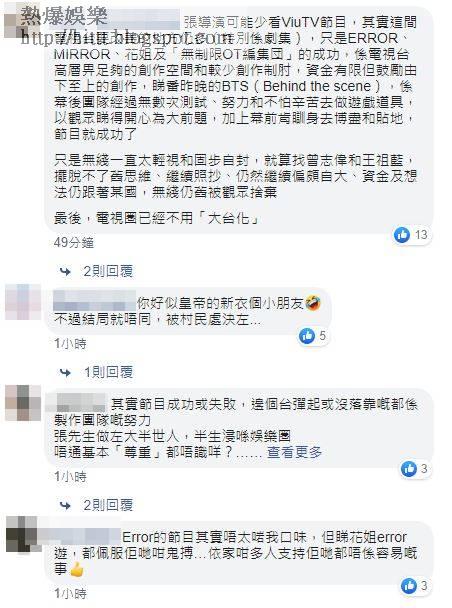 當中有網民覺得ERROR節目系列成功,是花姐肯放手給Mike導去做,有權力能放下才走出更高層次。留言中也有網民對張堅庭改觀而寫上「我一向都好尊重張導,曾經返工嘅時候同你有一面之緣,覺得你個人有禮貌冇架子,點知今日你竟然用呢啲字眼去形容一班咁用心去做事嘅年輕人,我有啲失望。」更有網民指藉此抽水「近排好多人都想抽吓水,博出位,因為你自己已經冇嘢值得人留意。」其實平日只看大台劇集的查小欣,日前也在專欄踩《ERROR自肥企画》低俗,被網民指所謂「娛樂教母」跟時代脫節。