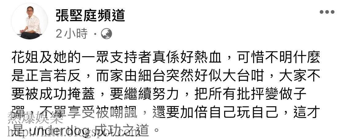 張堅庭今日下午再在個人社交專頁,撰文回應網民留言對他評論《花姐ERROR遊》一事,他寫上:「花姐及她的一眾支持者真係好熱血,可惜不明甚麼是正言若反,而家由細台突然好似大台咁,大家不要被成功掩蓋,要繼續努力,把所有批評變做子彈,不單享受被嘲諷,還要加倍自己玩自己,這才是underdog成功之道。」有網民留言「多謝張堅庭曲線讚賞,大家加油,香港人加油,張導也是同路人。」、「某些香港人缺乏咗啲幽默感﹗」及「願意為理想而付出的人,值得尊敬。」等。
