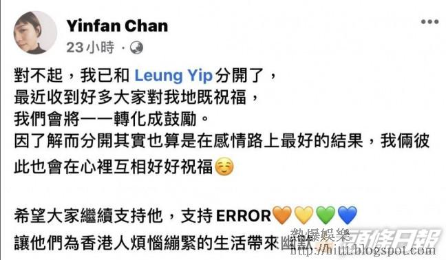 ERROR因為ViuTV節目《ERROR自肥企画》而爆紅,終於如花姐所願,但隊長肥仔(梁業)的初戀女友阿芬於上周二在FB宣布跟肥仔結束八年情,31歲的肥仔事業得意愛情就未能結果,事後肥仔坦承跟阿芬已分手一段時間。