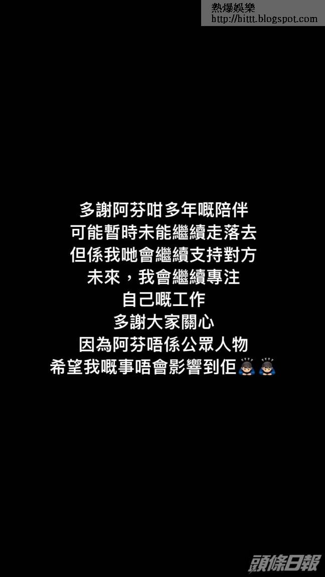 舊愛公開「分訊」五日後,肥仔終於在IG Story就分手一事發表感言:「多謝阿芬咁多年嘅陪伴,可能暫時未能繼續走落去,但係我哋會繼續支持對方,未來,我會繼續專注自己嘅工作,多謝大家關心,因為阿芬唔係公眾人物,希望我嘅事唔會影響到佢」。一句暫時未能繼續走落去好明顯留復合後路,肥仔跟阿芬曾經都分過手再復合,再重新開始都唔係冇可能,話晒兩人都係對方的初戀情人。