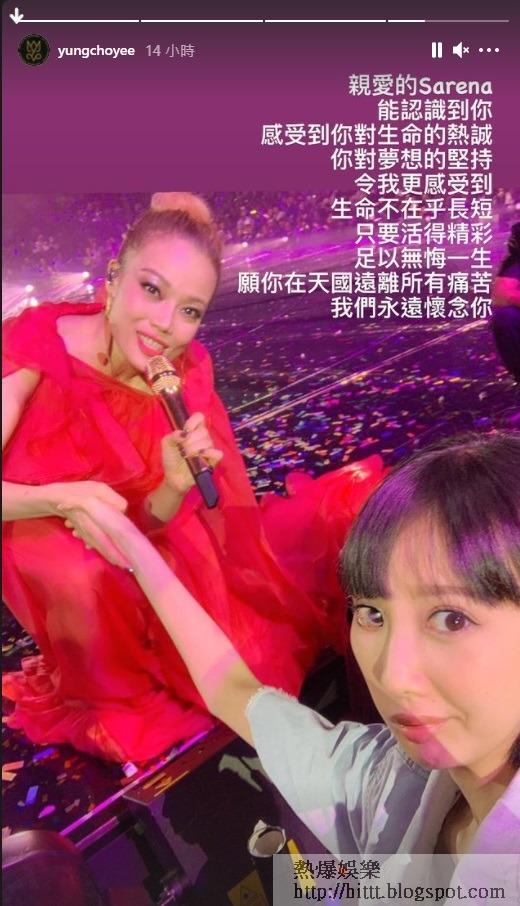 李明蔚的偶像容祖兒貼出合照悼念Sarena,並表示感受到她對生命的熱誠以及對夢想的堅持。