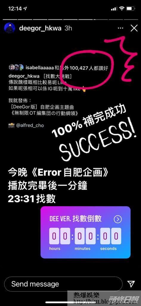 《ERROR自肥企画》播埋呢個星期就完嘞,係咪開始唔捨得呢?繼梁業(肥仔)及保錡「找數」獻唱主題曲《無制限OT編集團の行動綱領》後,何啟華(阿Dee)前日亦在IG上載花絮照片說:「找數大挑戰!傳說醜樣嘅相比較易呃Like,如果呢張相可以喺IG呃到十萬like,我就發佈『DeeGor版』自肥企画主題曲《無制限OT編集団の行動綱領》 !」以ERROR今時今日嘅地位,一個Po要過十萬Like?輕鬆啦。用咗一日時間已達標,阿Dee尋晚喺IG Story已預告《ERROR自肥企画》播畢後一分鐘即找數,然後冇然後嘞,睇片啦,大叫啦,好型呀阿B。(怕鬼咗你阿Dee暱稱叫阿B呀)