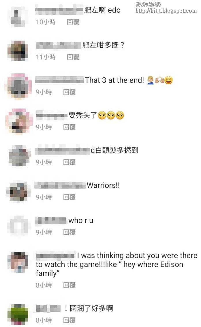相中焦點都放在Edison上,戴上眼鏡的Edison頭髮鏟青後現M字額,面戴兩個口罩仍遮掩不到脹爆臉孔,不少網民都留言「肥咗啊edc」、「肥咗咁多嘅?」、「who r u」、「要秃頭了」及「幸福的變胖了」等。男神老去,其舊愛鍾欣潼(阿嬌)早前接受訪問時脹爆畫面,同樣震撼,即使阿嬌解釋是因為將接拍電影為角色準備而蓄肥,或者事後貼出弗爆靚相,仍是抹不掉大家記憶中的畫面。