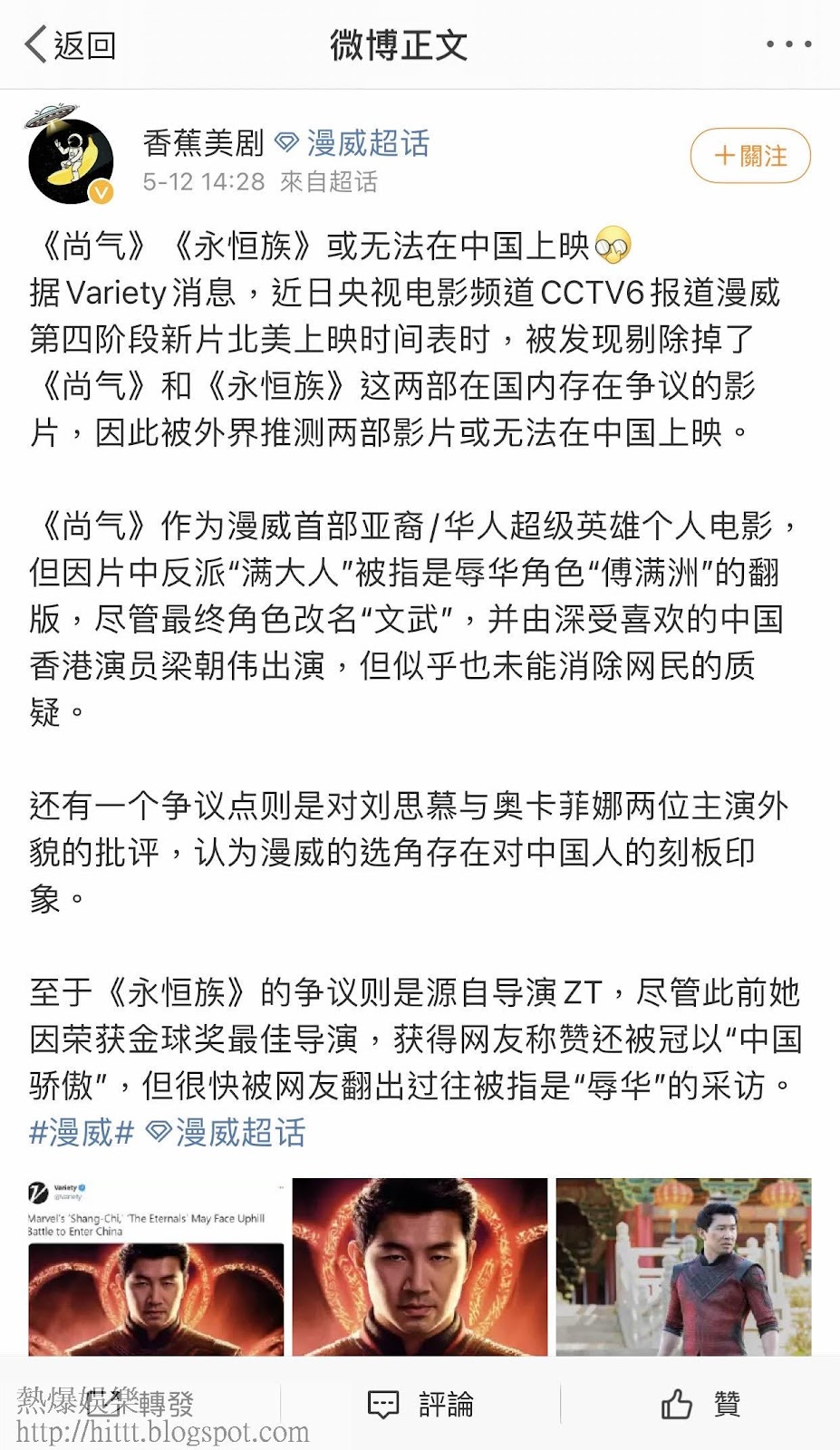 據美媒《Variety》報道,兩部排隊上映的Marvel大作《尚氣與十環傳奇》(Shang-Chi and the Legend of the Ten Rings)和《永恆族》(The Eternals),或無法在中國上映,近日央視電影頻道報道Marvel第四階段時間表,已把《尚氣》同《永恆族》的上映檔期刪去,懷疑是與「政治因素」有關,就連微博的電影專頁也有提及相關消息。