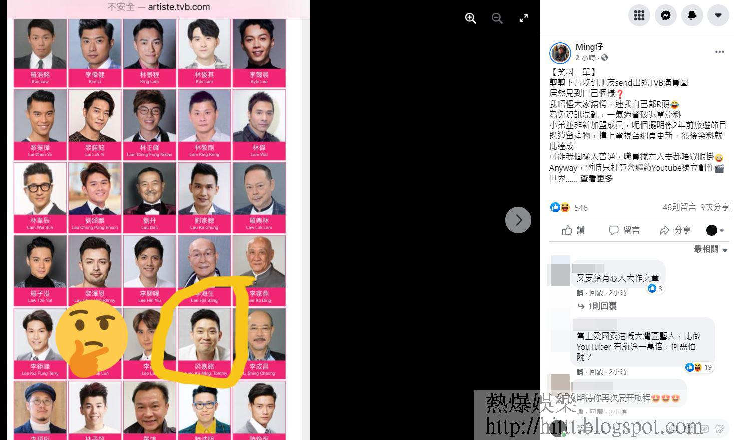 有香港YouTuber始祖稱號的梁嘉銘(Ming仔)年前與被網民抵制的TVB拍攝旅遊節目而被鬧爆,更被質疑政治立場,致其YouTube頻道人數「直插式」急跌超過10萬。雖然Ming仔當時表示與大台合作是在反修例風波前洽談,不過今日在大台網站中男藝人部份卻驚見MIng仔照片出現。