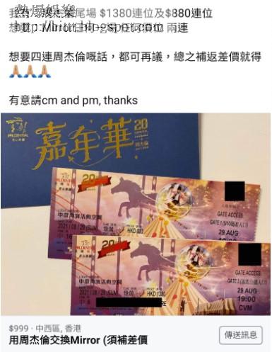 距離今晚開騷只剩數小時,這張尾2場逾11萬的門票仍未售出,而明晚尾場的逾23萬天價門票同樣未有人問津,反而B行靚位$17,153已售出,比原價$1,280炒貴十倍。另有網民為求門票,分別提出用黎明頭場飛、周杰倫尾場飛換MIRROR飛,有網民留言指冇可能,另有網民就想排買黎明和周董飛。