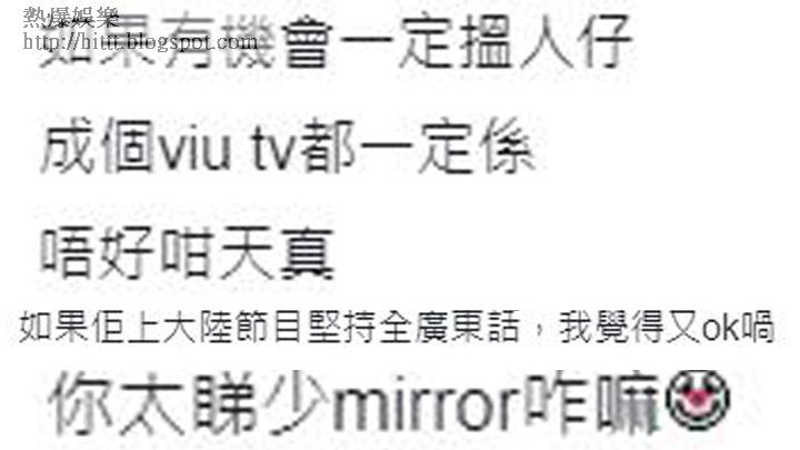 事實上,葉劉推MIRROR和ERROR上大陸做節目,網民的反應亦十分激烈,有姜糖說:「班大人可唔可以停止擺姜濤上枱」,亦有人說:「上咗去,就唔會再受青年人歡迎㗎喇!」更有網民反建議:「明明曹永廉先係年輕人嘅偶像!」、「應該搵《開心大綜藝》班友返大陸」。另一方面,亦有網民擔心MIRROR和ERROR會抵受不住大陸市場的誘惑,要鏡粉自我做足心理準備,不過亦有人說:「如果佢哋上大陸節目堅持全廣東話,我覺得又OK喎 !」而《蘋果》今日就此事致電MIRROR經理人花姐,但暫未有回覆。