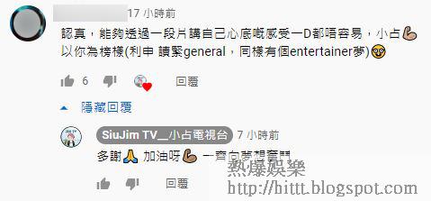 他回想MIRROR演唱會上,令他最感動的是Alton(王智德),他指Alton在MIRROR中不是最紅一個,而Alton曾形容自己在隊中是隱形人,令小占感受到自己在公司也是隱形人,他早前返公司時有人問他︰「你仲喺公司?」因此當他聽到Alton在演唱會台上說︰「人生總有啲路好難行,但你要堅持,只有堅持才可以去到目的地。」令小占更感同身受,他說︰「做自己想做嘅嘢唔好放棄,一日未死,總有機會實現夢想。」未來小占會好好裝備自己,並多謝所有支持和鼓勵他的人。他這段片獲網民好評,更有不少網民留言給他不要放棄,令他十分感動。