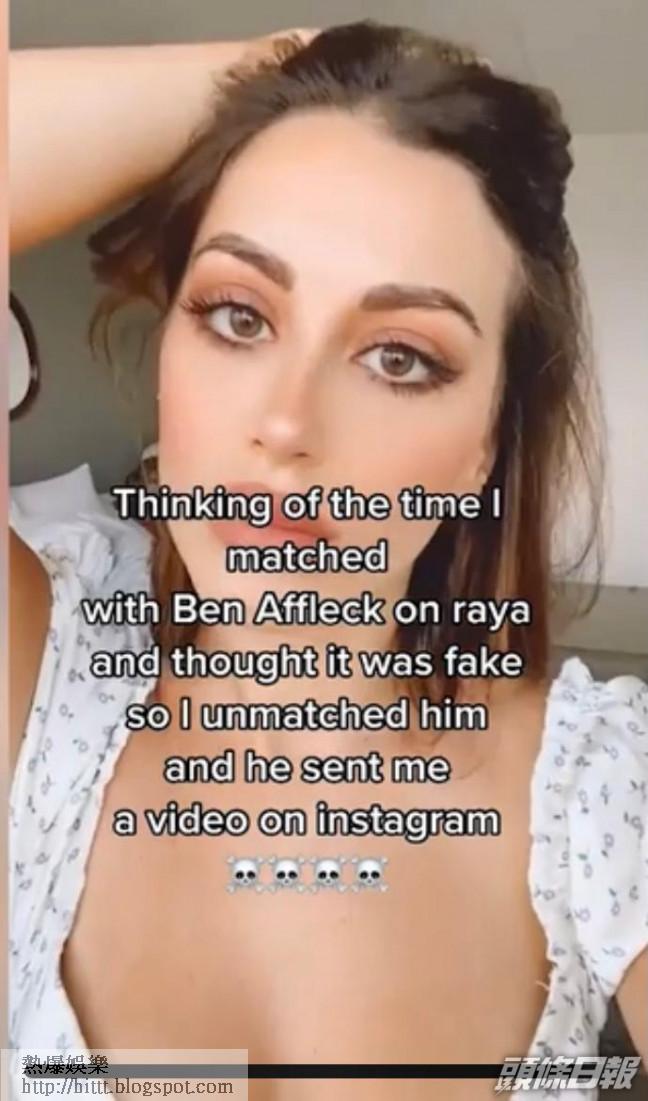 上月尾,「蝙蝠俠」賓艾弗力(Ben Affleck)被多次拍攝到離開剛甩拖的舊愛珍妮花洛庇絲(Jennifer Lopez)寓所傳翻撻。不過昨日模特兒Nivine Jay公開賓佬私訊她的短片,她透露在名人交友程式上與賓佬認識,但懷疑那是假賬號,於是刪除了對方,賓佬竟在另一社交網私訊她,更拍下短片證「真身」,賓佬問她:「Nivine,你為甚麼不理我?我是賓艾弗力。」事後女方竟將片段公開讓賓佬瘀爆。
