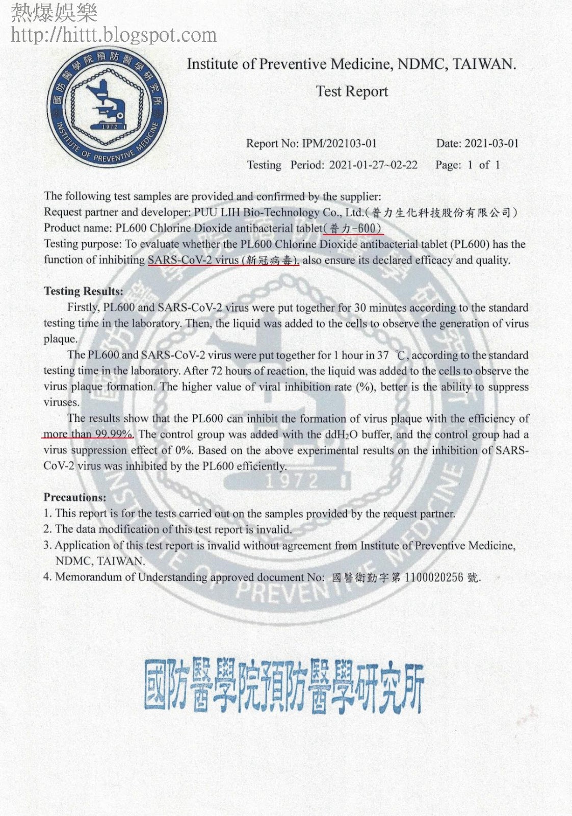根據普力生化科技公司自己公告出來的測試報告,「PL-600消毒錠」是經過國防部國防醫學院預防醫學研究所去針對新冠病毒所做的滅病毒報告,宣稱此消毒錠在消滅新冠病毒上效果可達99.99%以上。